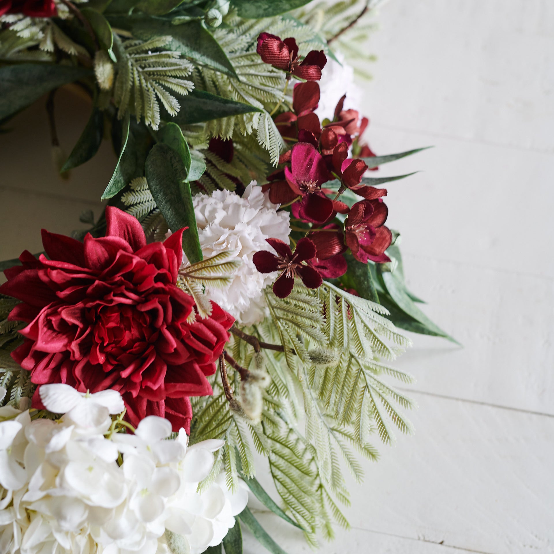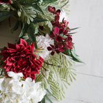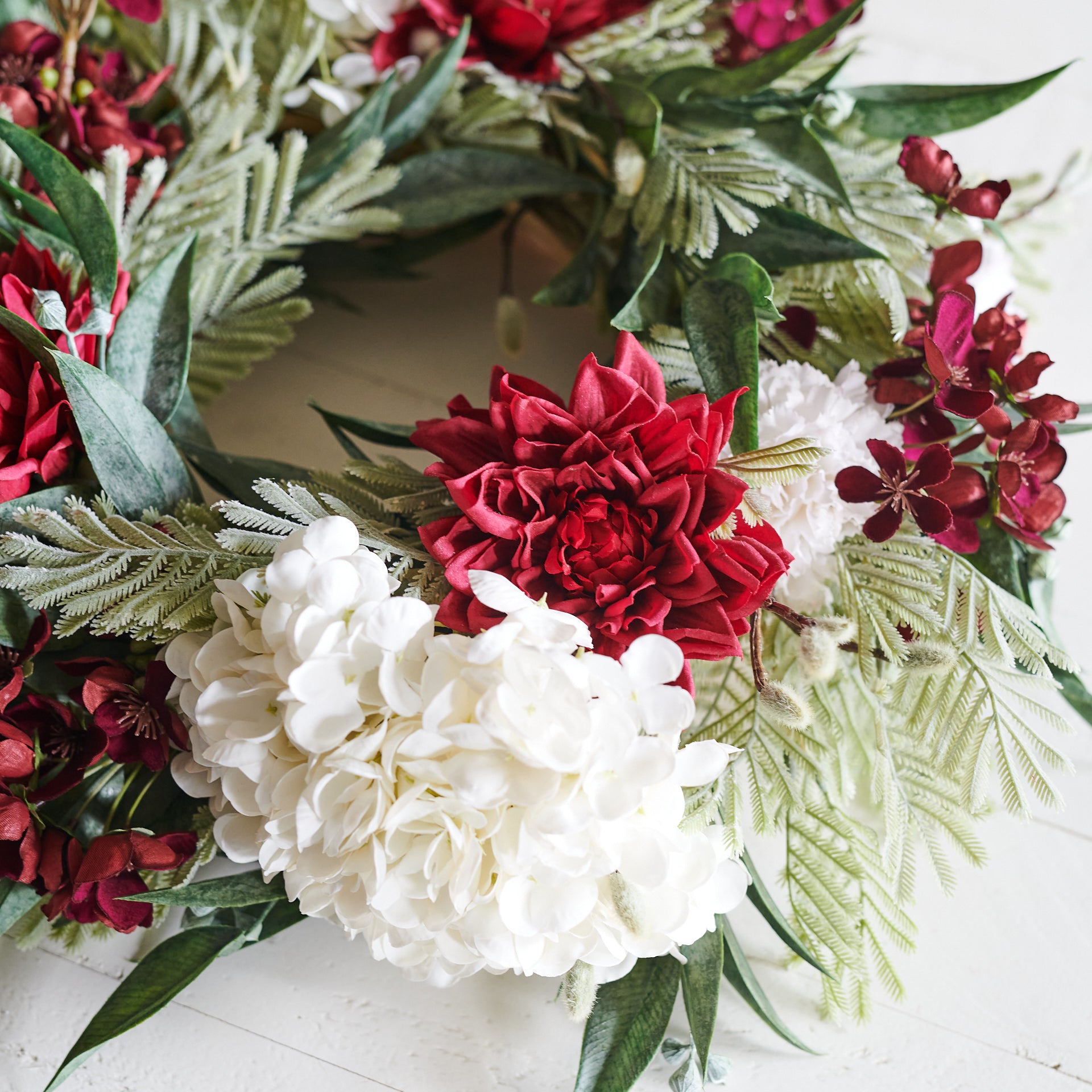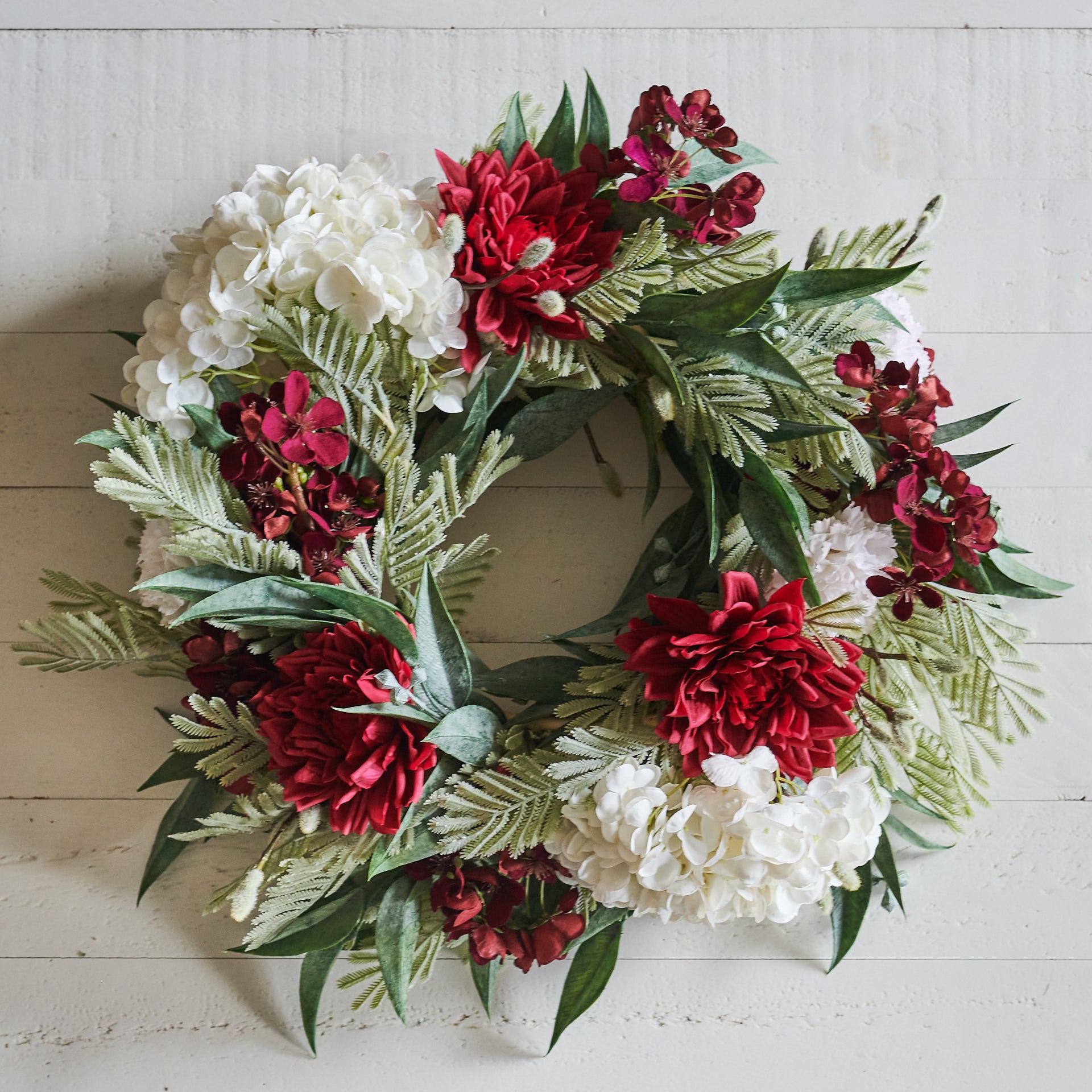 Handmade Wreath featuring real touch wattle leaf, hydrangeas and dahlias with magnolia bud and begonia flowers.