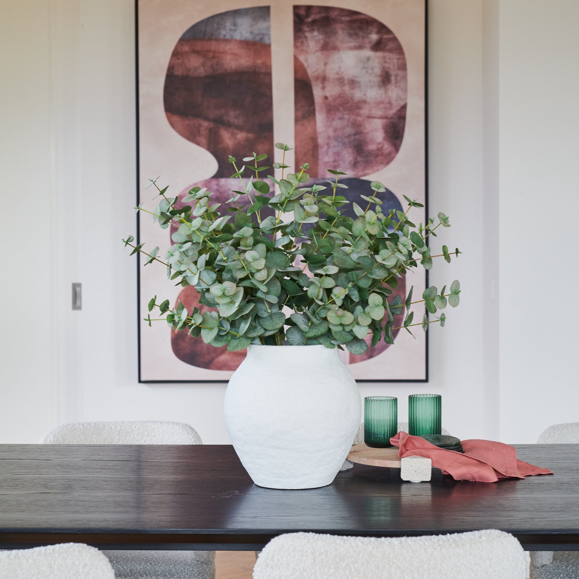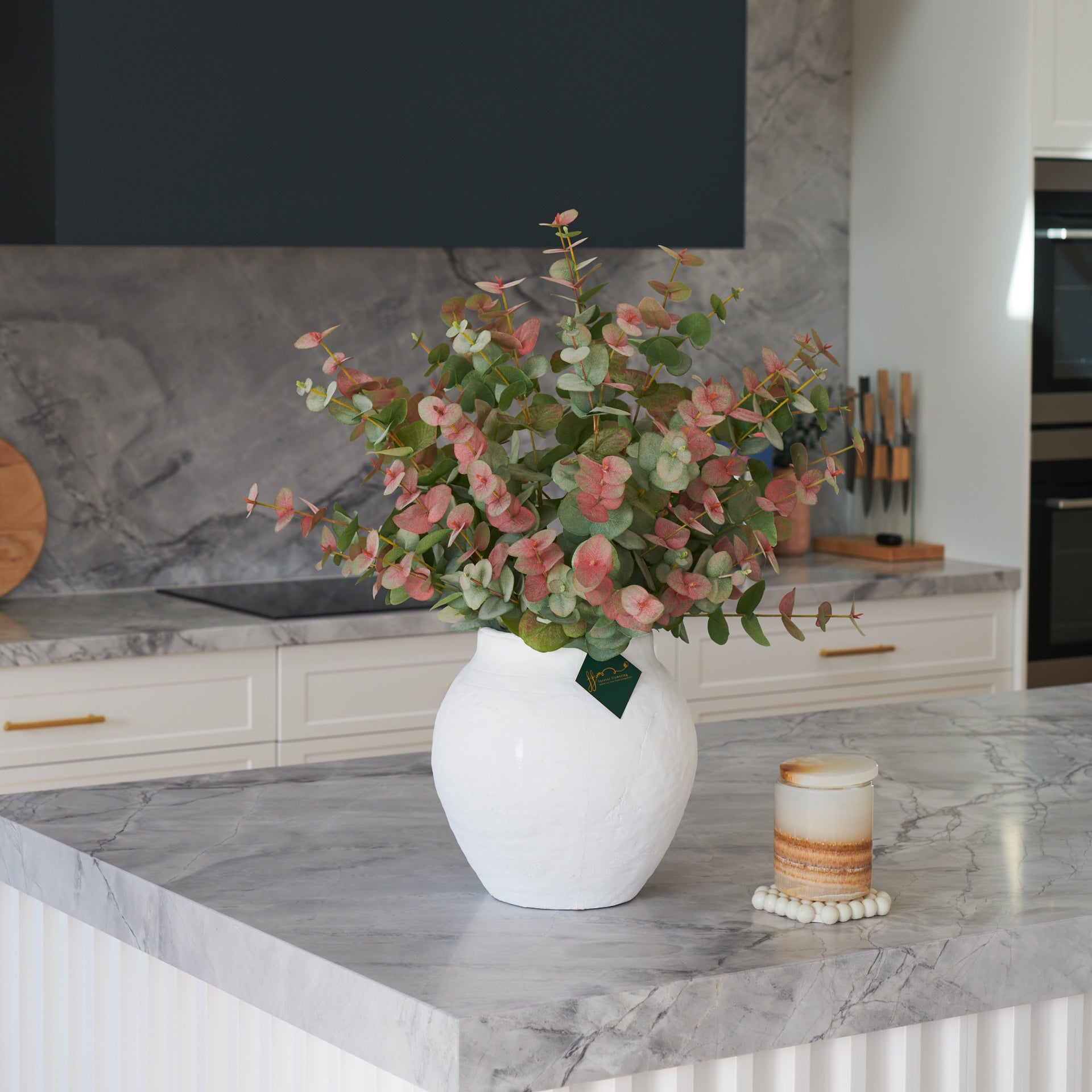360-degree Arrangement, featuring a neutral white ceramic pot with permanently set Eucalyptus Dollar Gum.