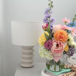 Real Touch Hydrangea, Delphinium, Peony, Carnations and Roses set in Glass Vase and Artificial Water. This is a 360 degree flower arrangement.