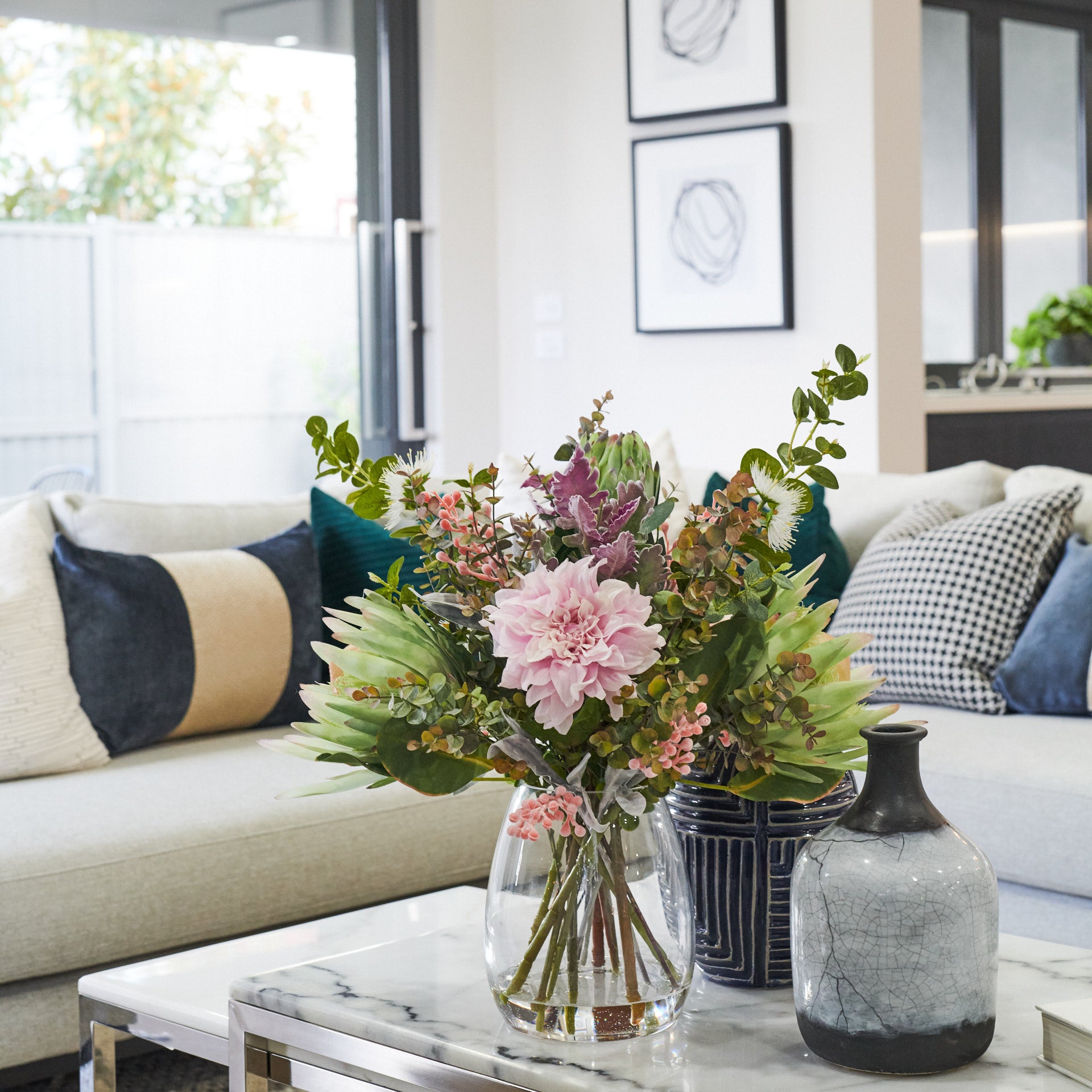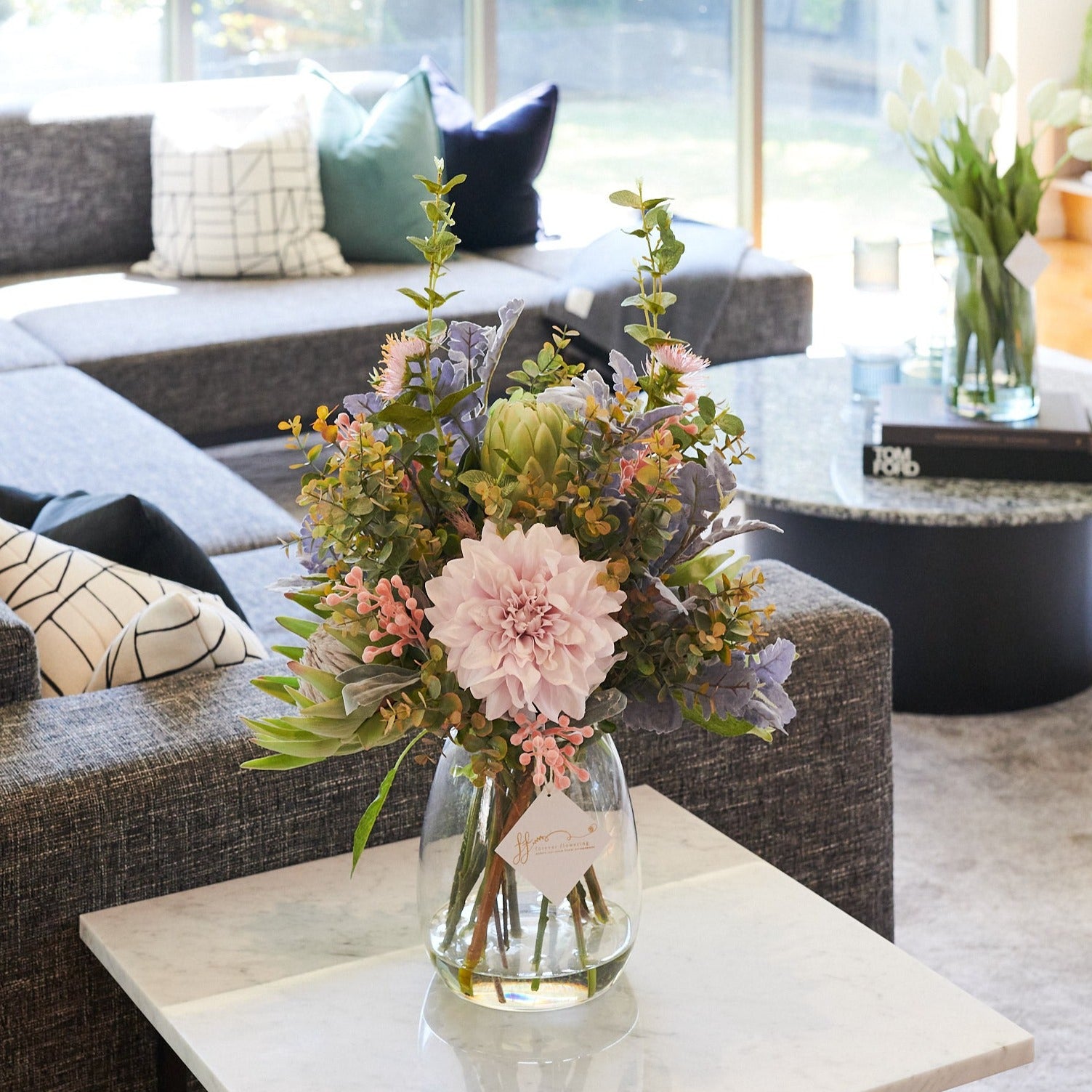 Real Touch King and Queen Proteas, Dahlias, Wattle, Dusty Miller, Dollar Gum Blossom Flower and Eucalyptus Leaves in Belly Vase and Artificial Water. This is a 360-degree flower arrangement.