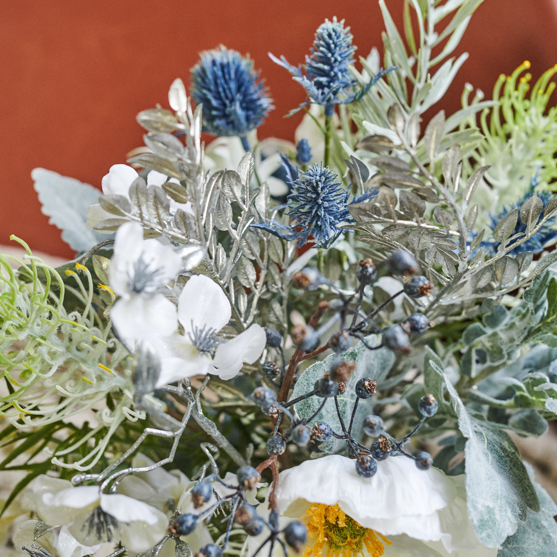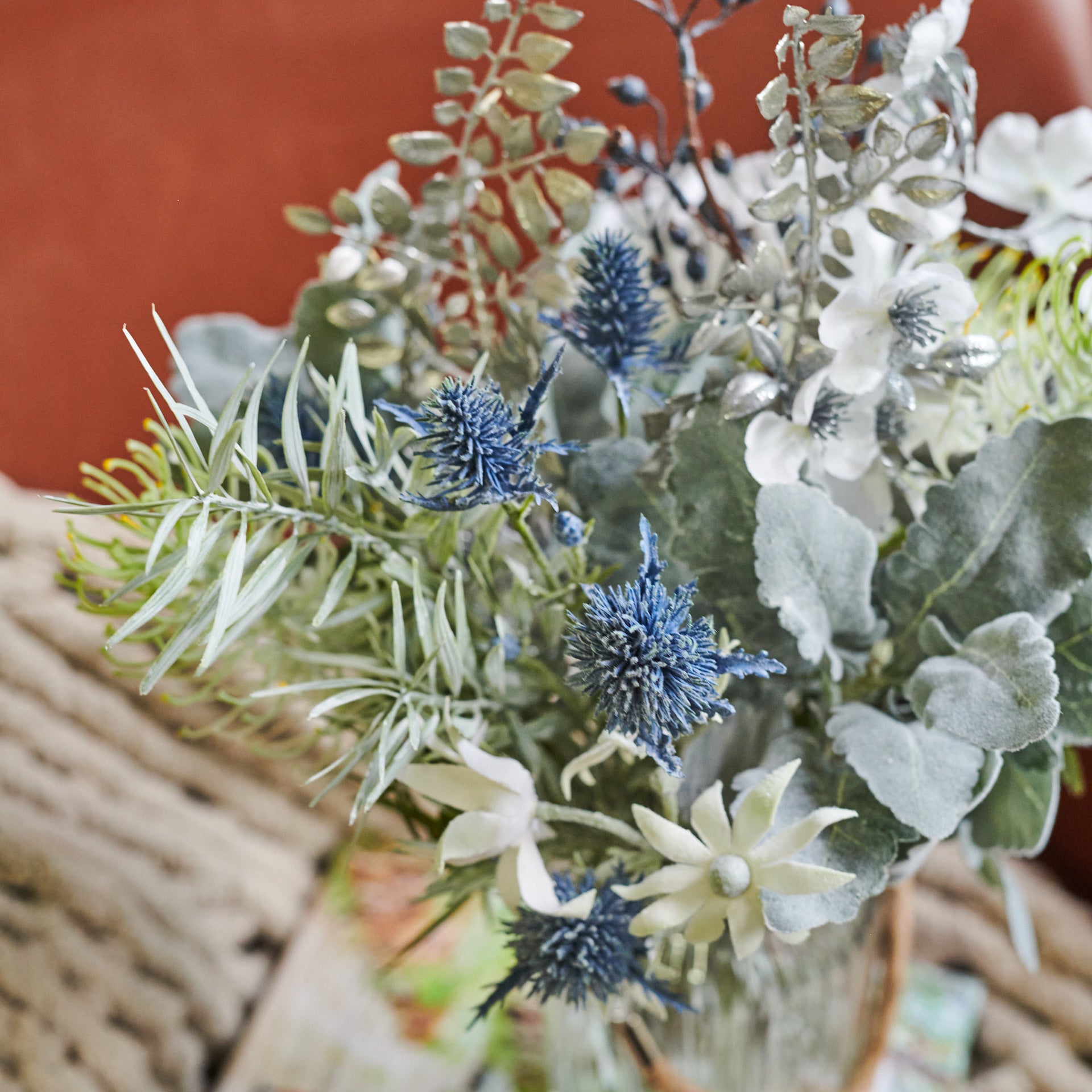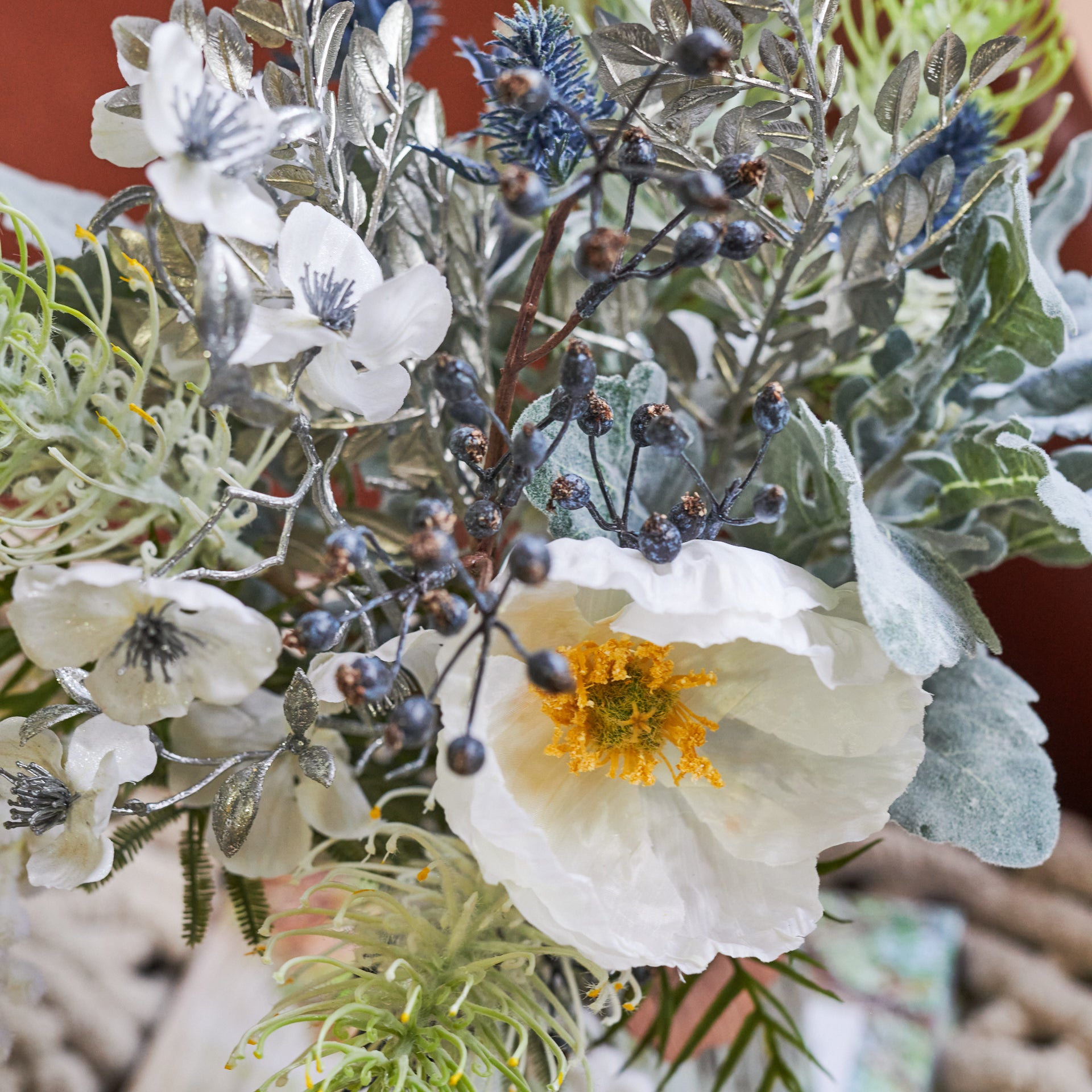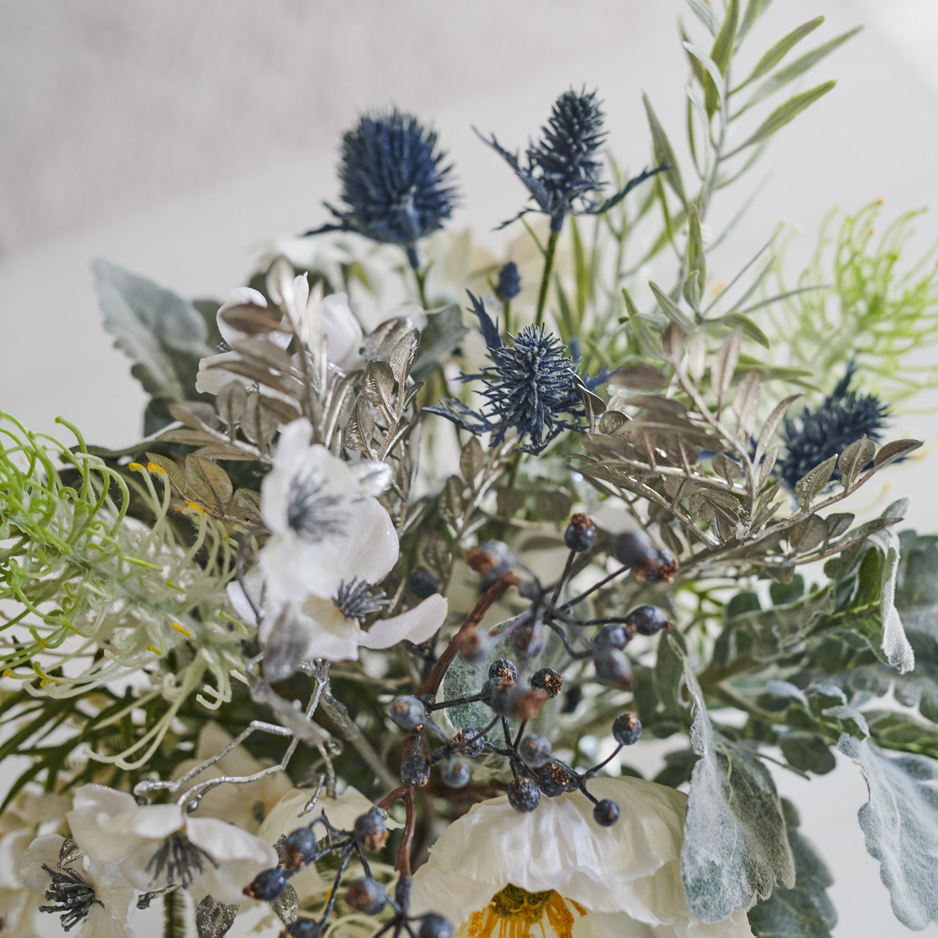 Real Touch Poppy, Dusty Miller and Thistle with Rosehip, Grevillea and Silver Accents set in Glass Vase in Artificial Water.