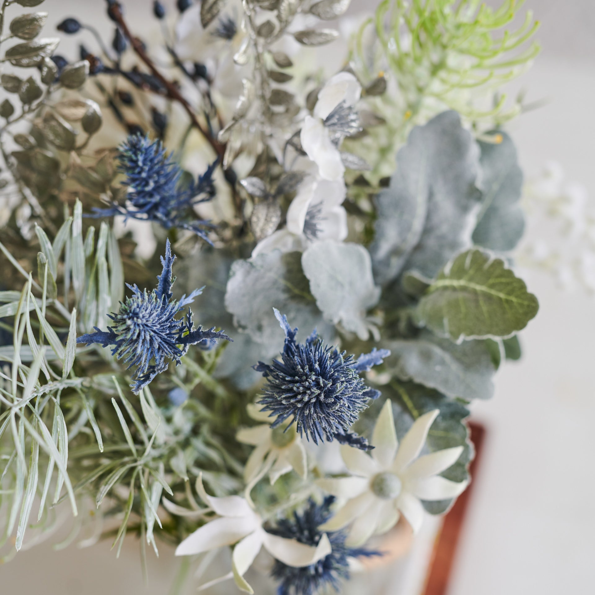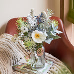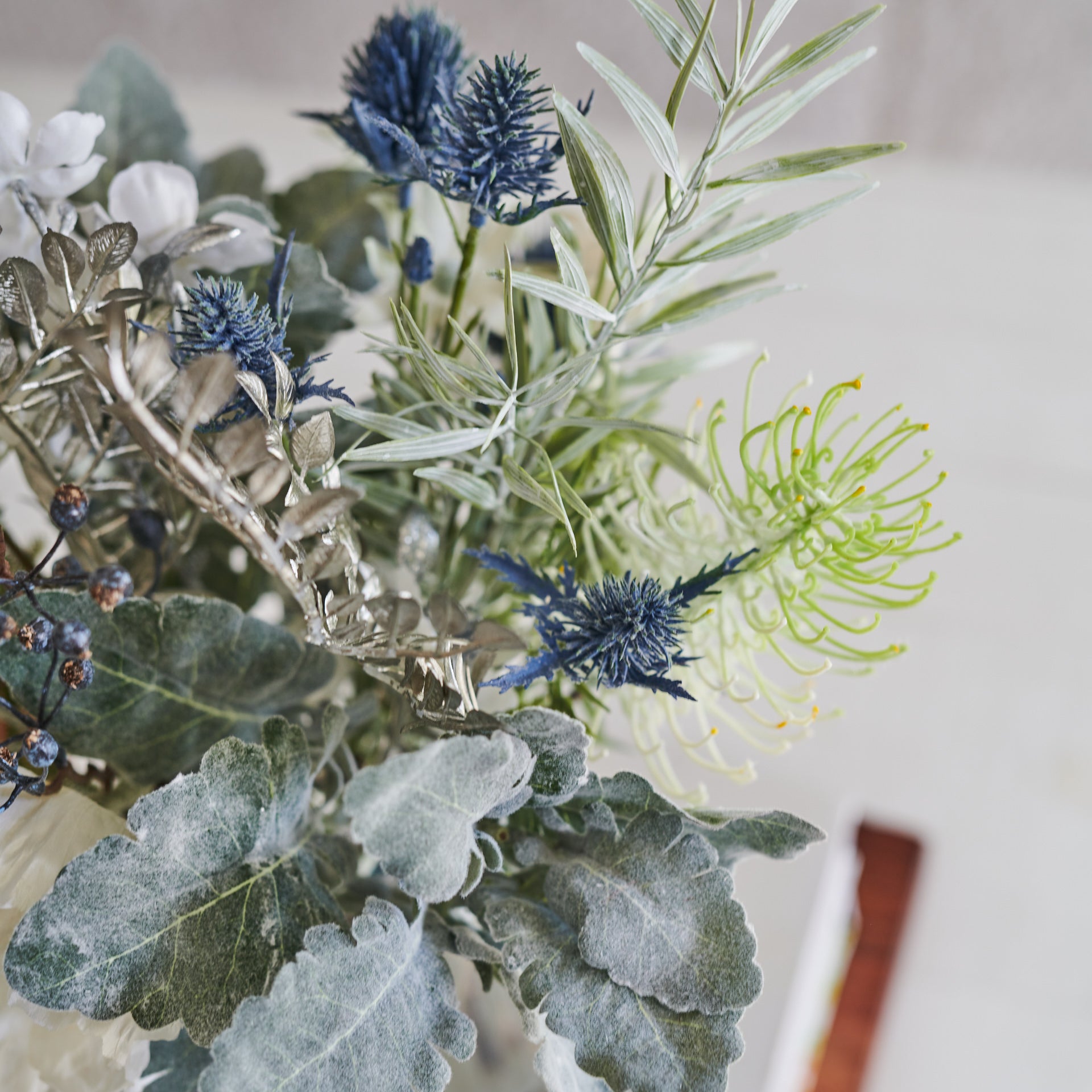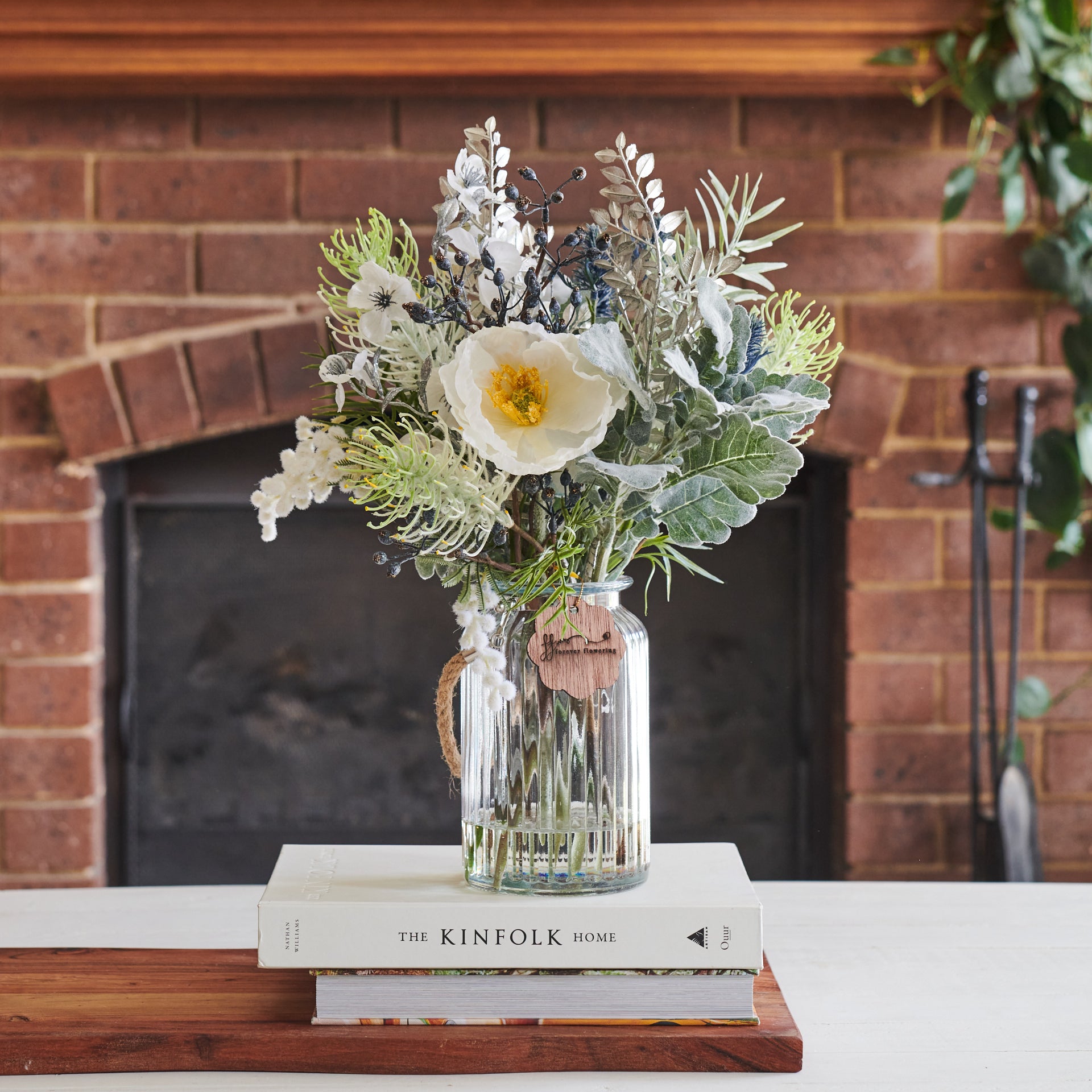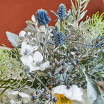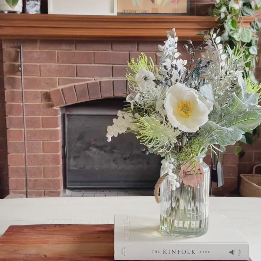 Real Touch Poppy, Dusty Miller and Thistle with Rosehip, Grevillea and Silver Accents set in Glass Vase in Artificial Water.