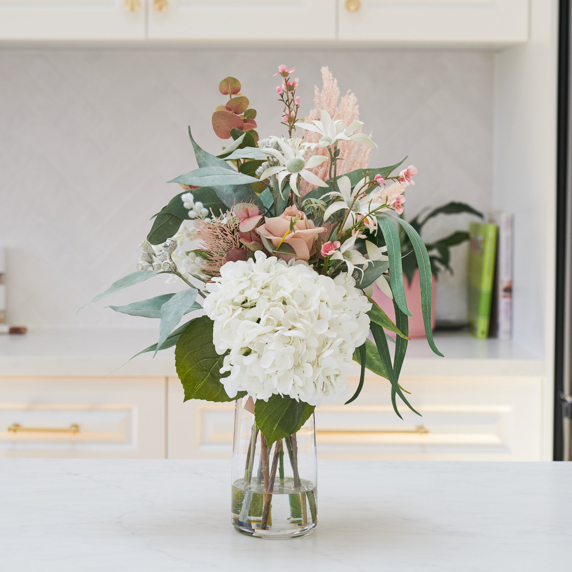 Eucalyptus, Plume Grass, Rose and Hydrangea with Wax Flower, Flannel Flower and Long Leaf in Glass Vase and Artificial Water.