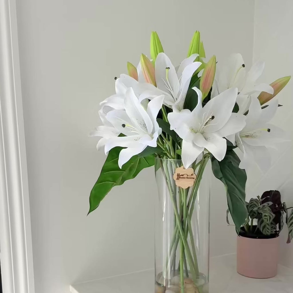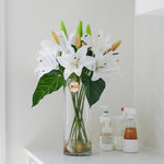 Real touch Casablanca lilies and buds with calla leaves set in artificial water.