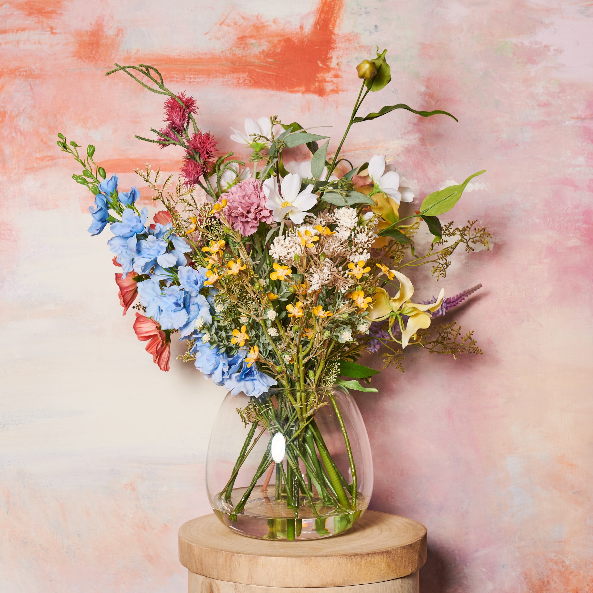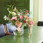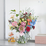 Real Touch Ranunculus, Baby Breath Bush, Carnation, Veronica, Queen Anne Lace, Delphinium, Grevillea, Ranunculus, Gloriosa, Calla Lily, Star Flower, Cosmo, Limonium, Eucalyptus Seed Leaf and Wax Flower in a Posey Glass Vase and Artificial Water. This is a 360-degree flower arrangement. Height 57cm Width 45cm
