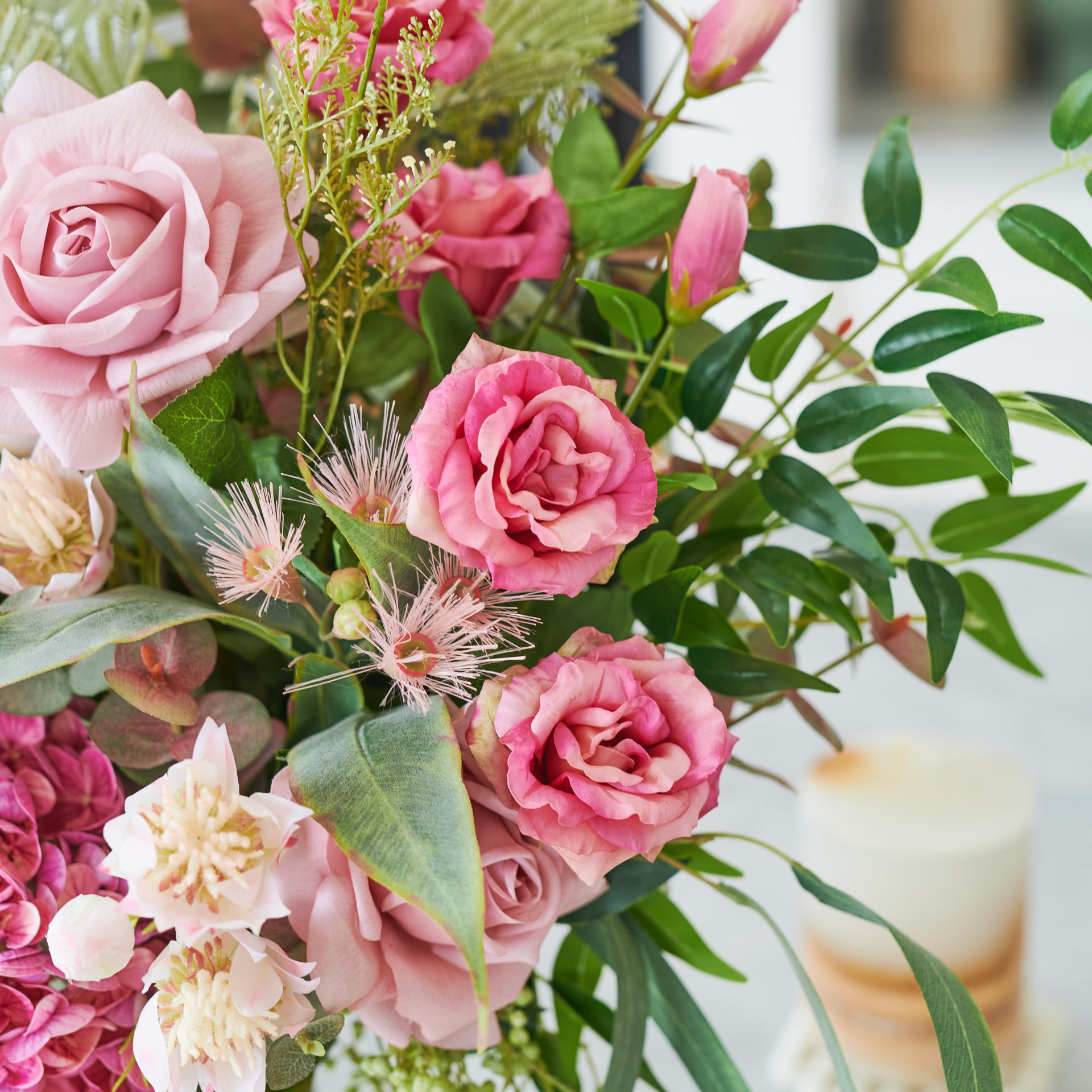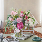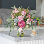 A soft statement piece featuring Real Touch Eucalyptus, Blossom, Hydrangea, Clematis and Lisianthus with Blushing Bride, Dusty Miller, Austin Roses, Seeding Berry and Long Leaf Set in a Belly Vase with Artificial Water.