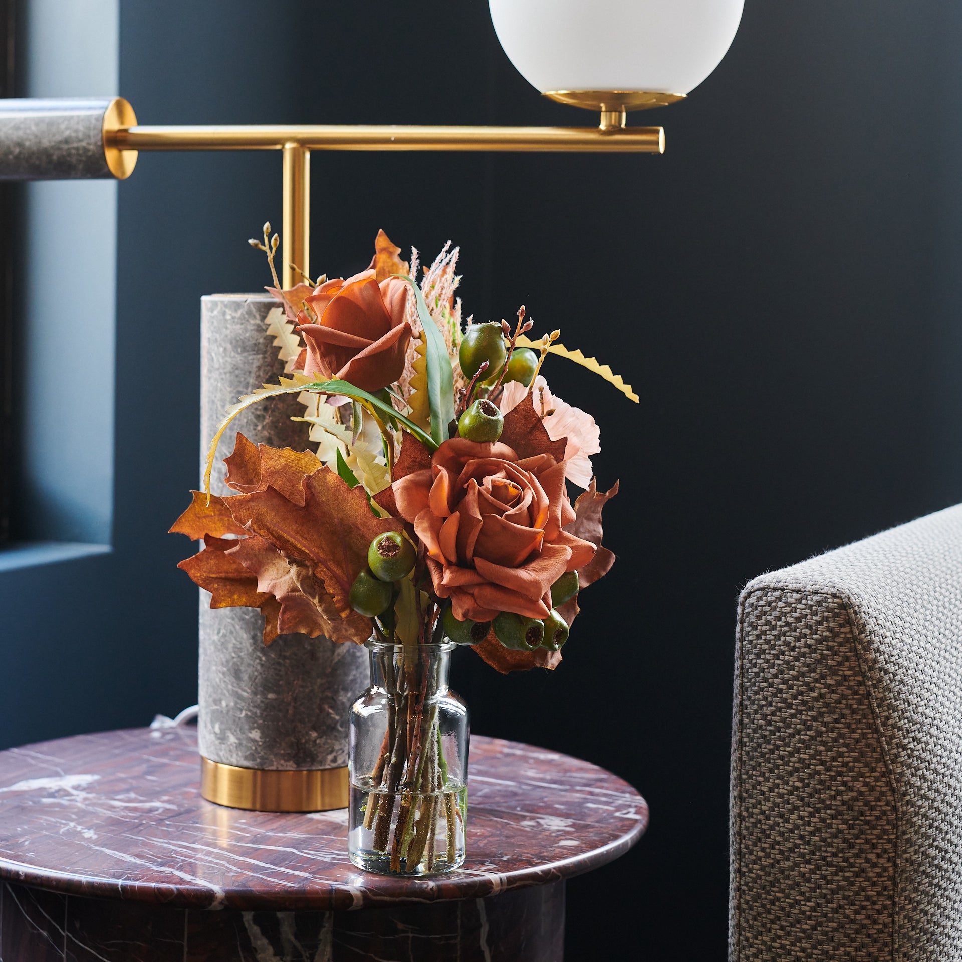 David : Real Touch Artificial Banksia, Roses and Poppies with Gum Nuts, Kalanchoe buds and Maple Autumn leaves. This arrangement is single sided.
