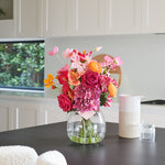 Real Touch Hydrangea, Cosmos and Poppies with Clematis, Ranunculus and Hibiscus in Glass Vase with Artificial Water.