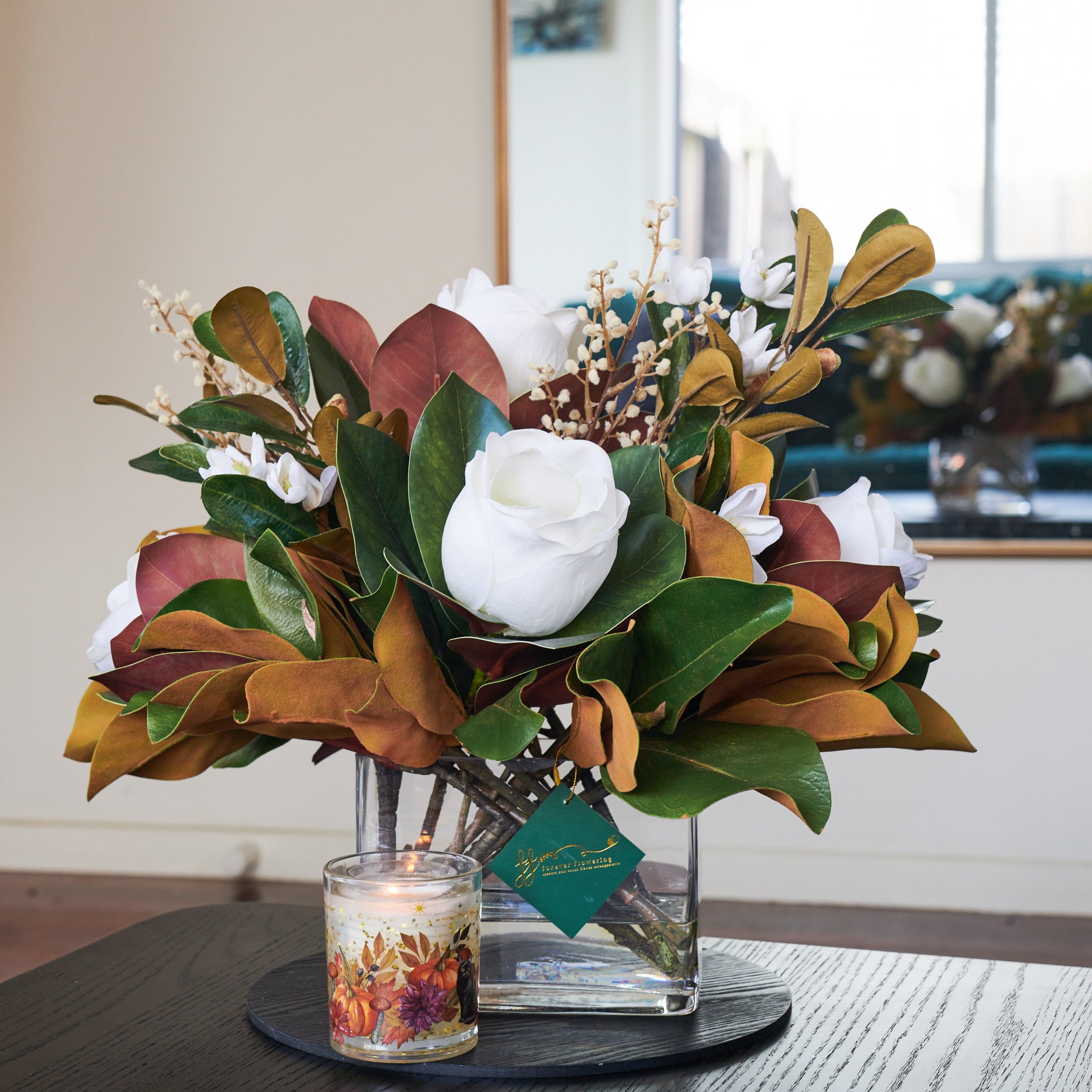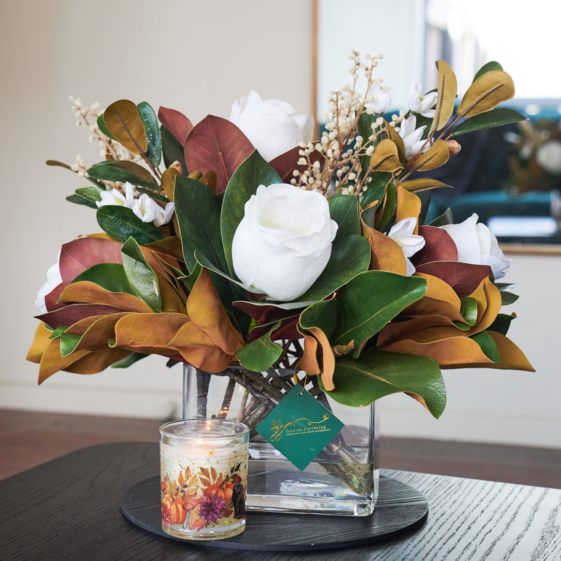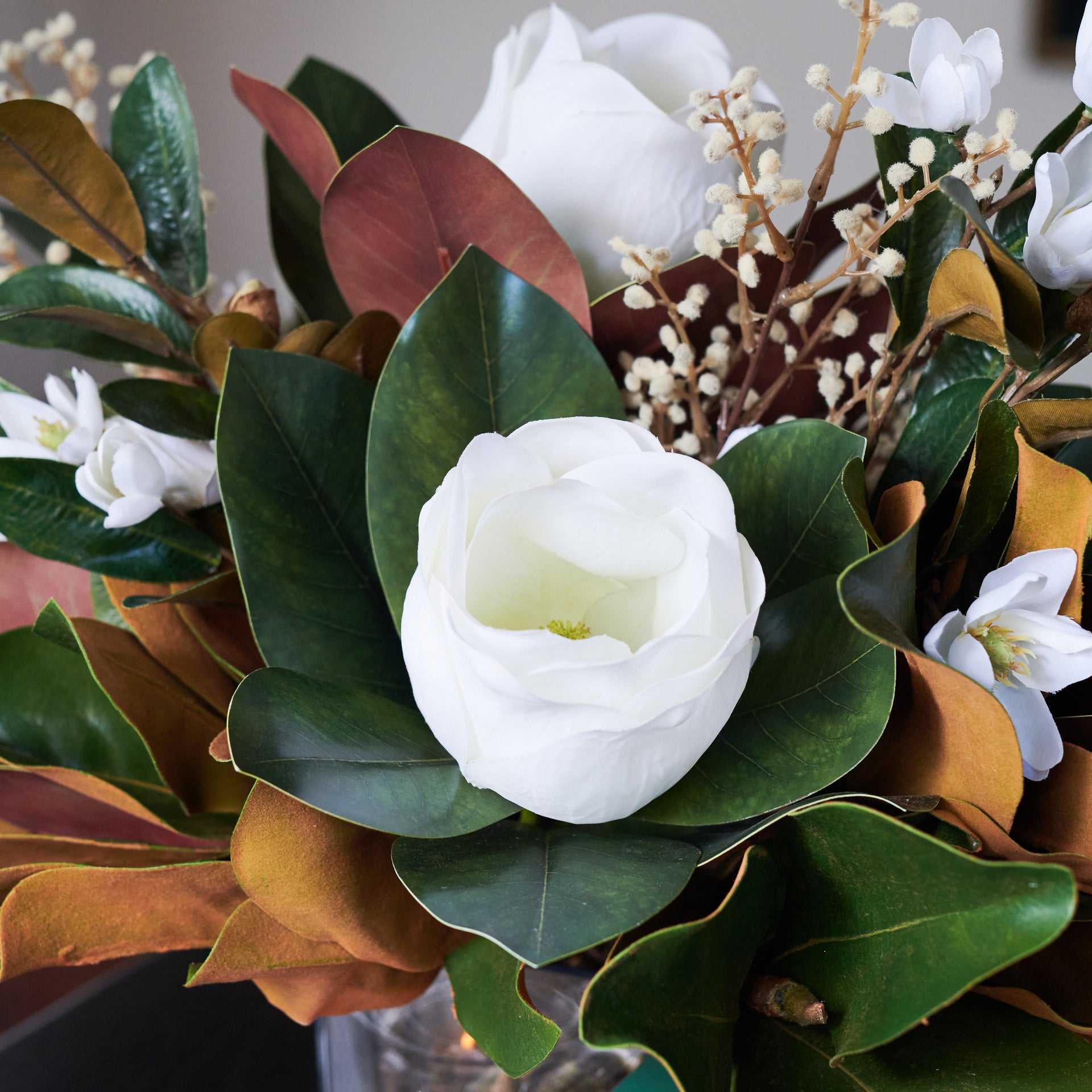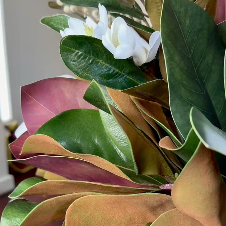 Real Touch Magnolia Flowers, Magnolia Leaves, Willow and Branch Sticks and Magnolia Spray in a Rectangle Vase and Artificial Water. This is a 360-degree flower arrangement.