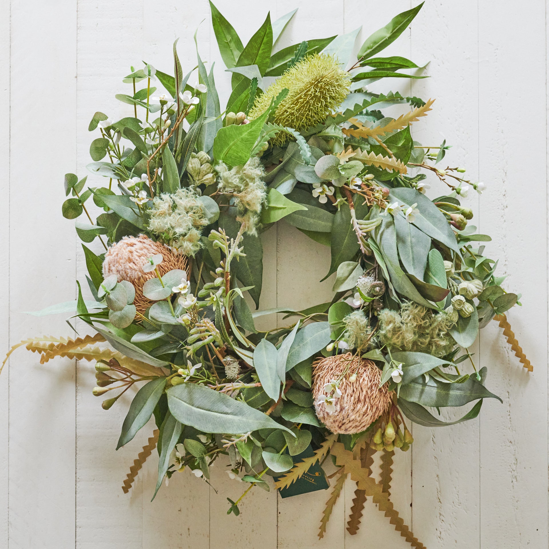 Handmade Wreath featuring a realistic combination of Real Touch Australian Natives including Eucalyptus and Gum Nuts, Smoke Bush, Banksias, Kangaroo Paw and Wax Flower.