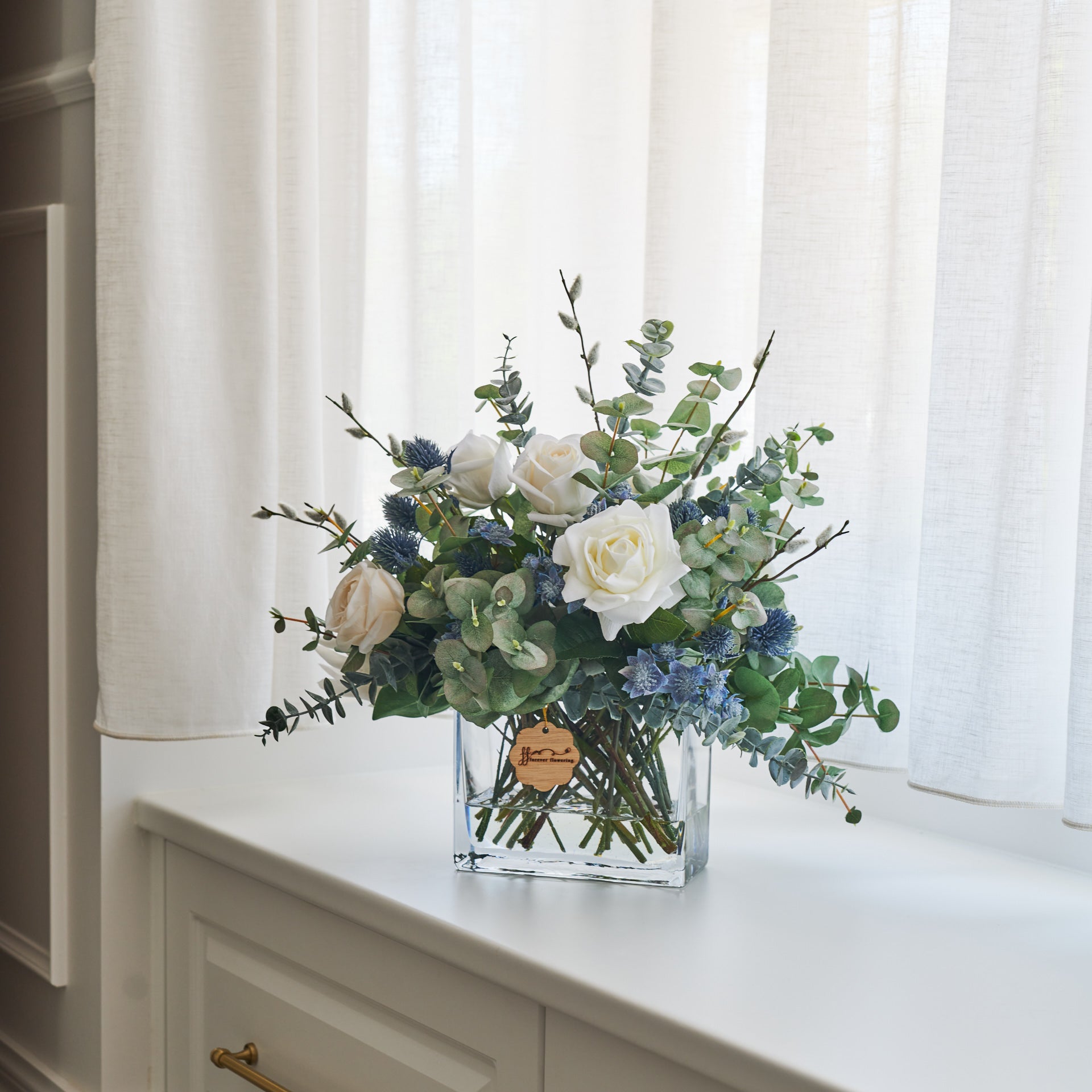 Real touch Roses, King Protea and Spinning Gum with Thistle, Willow and Astrantia set in Glass Rectangle Vase in Artificial Water.