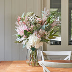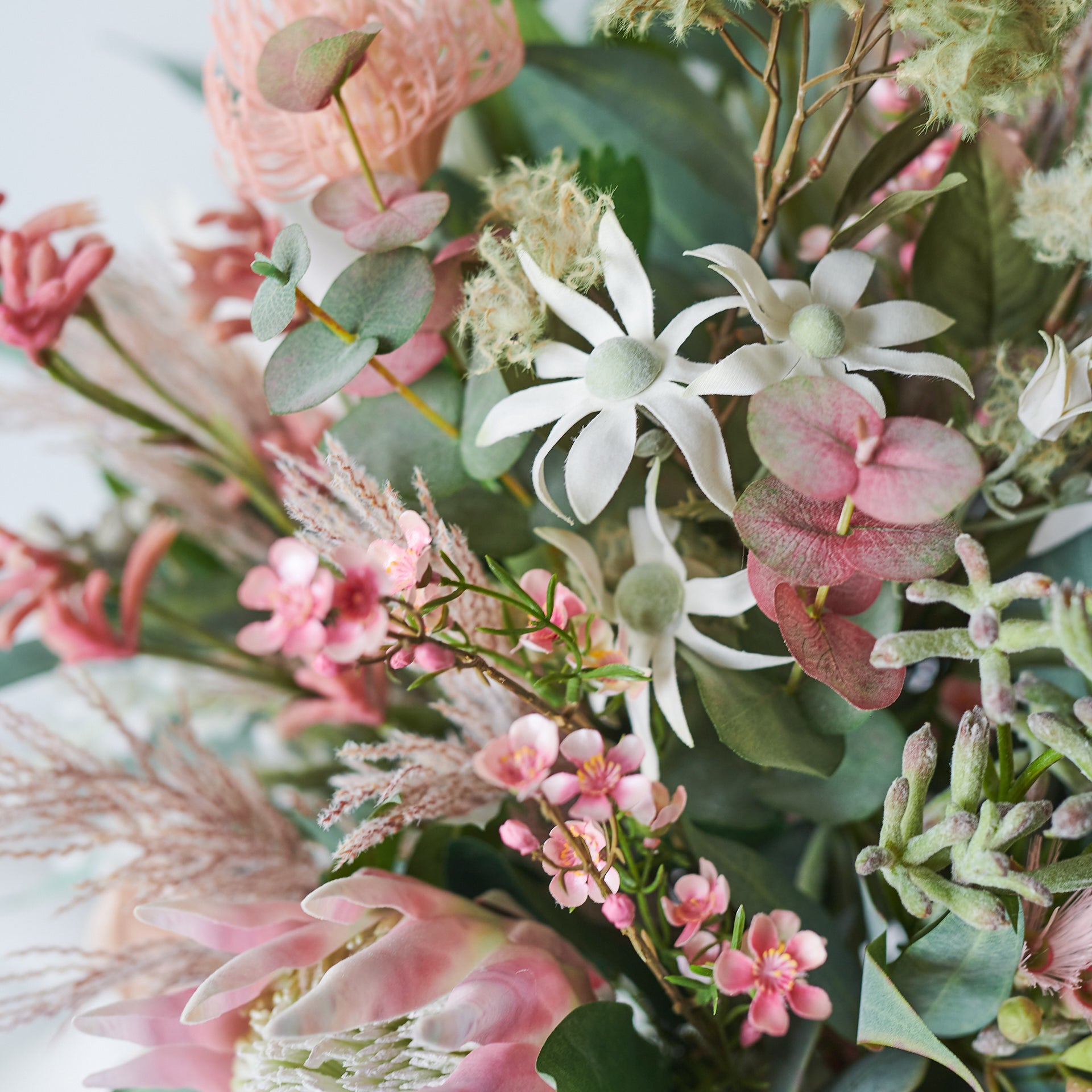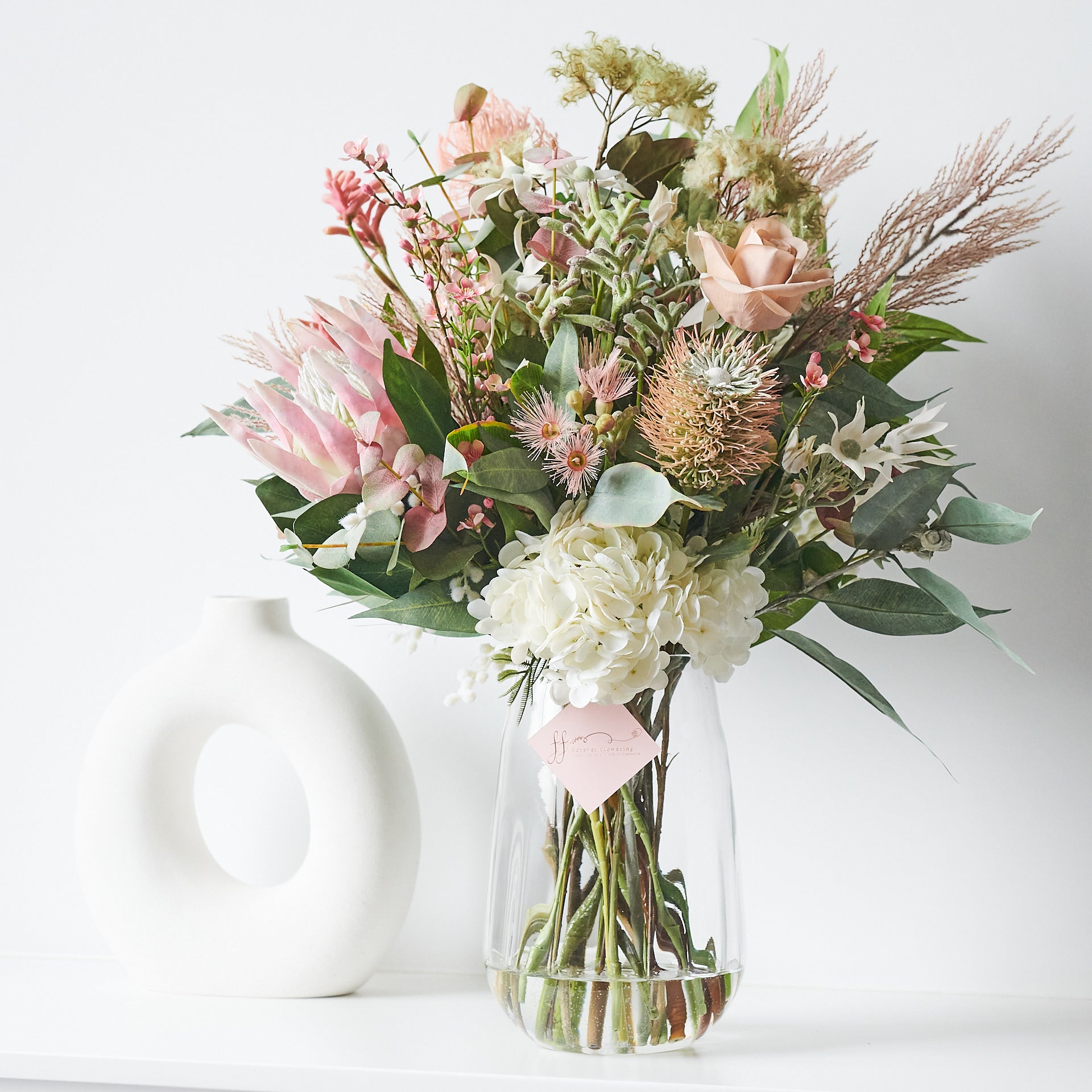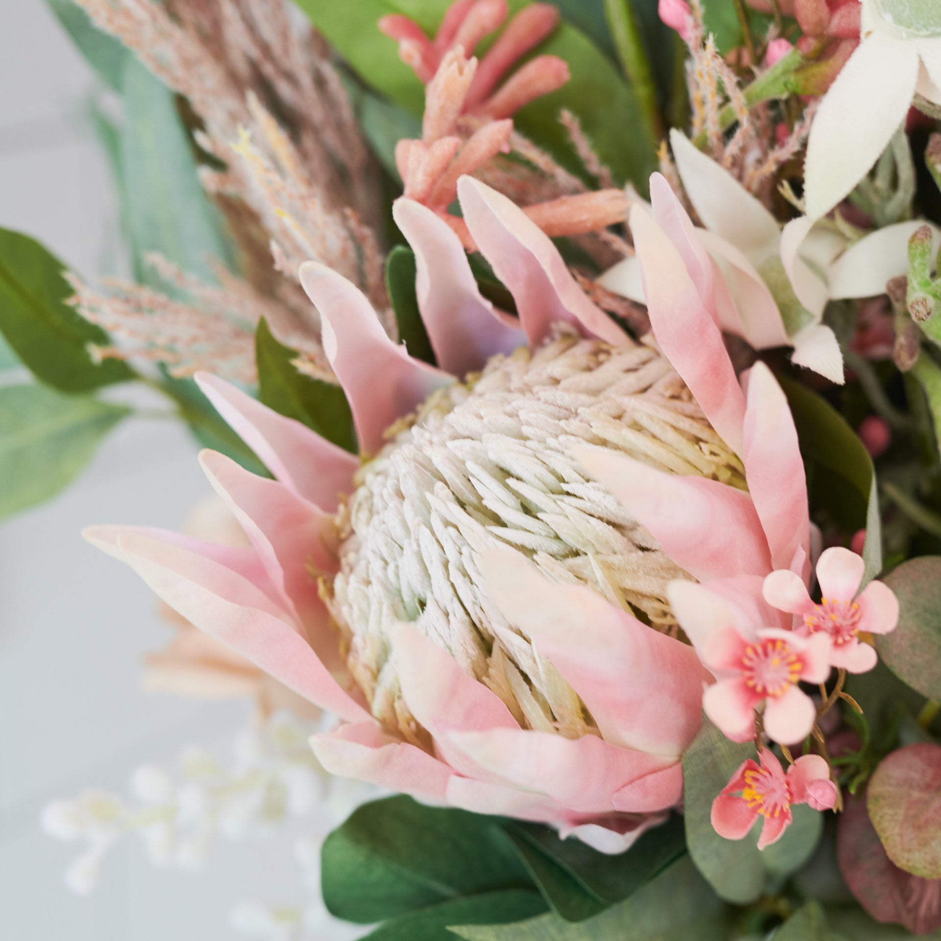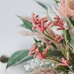 Blush : Australian Native Real Touch Flannel Flower, Long Leaf Eucalyptus and Wax Flower set in Glass Vase and Artificial Water.Height: 30cmWidth: 20cm